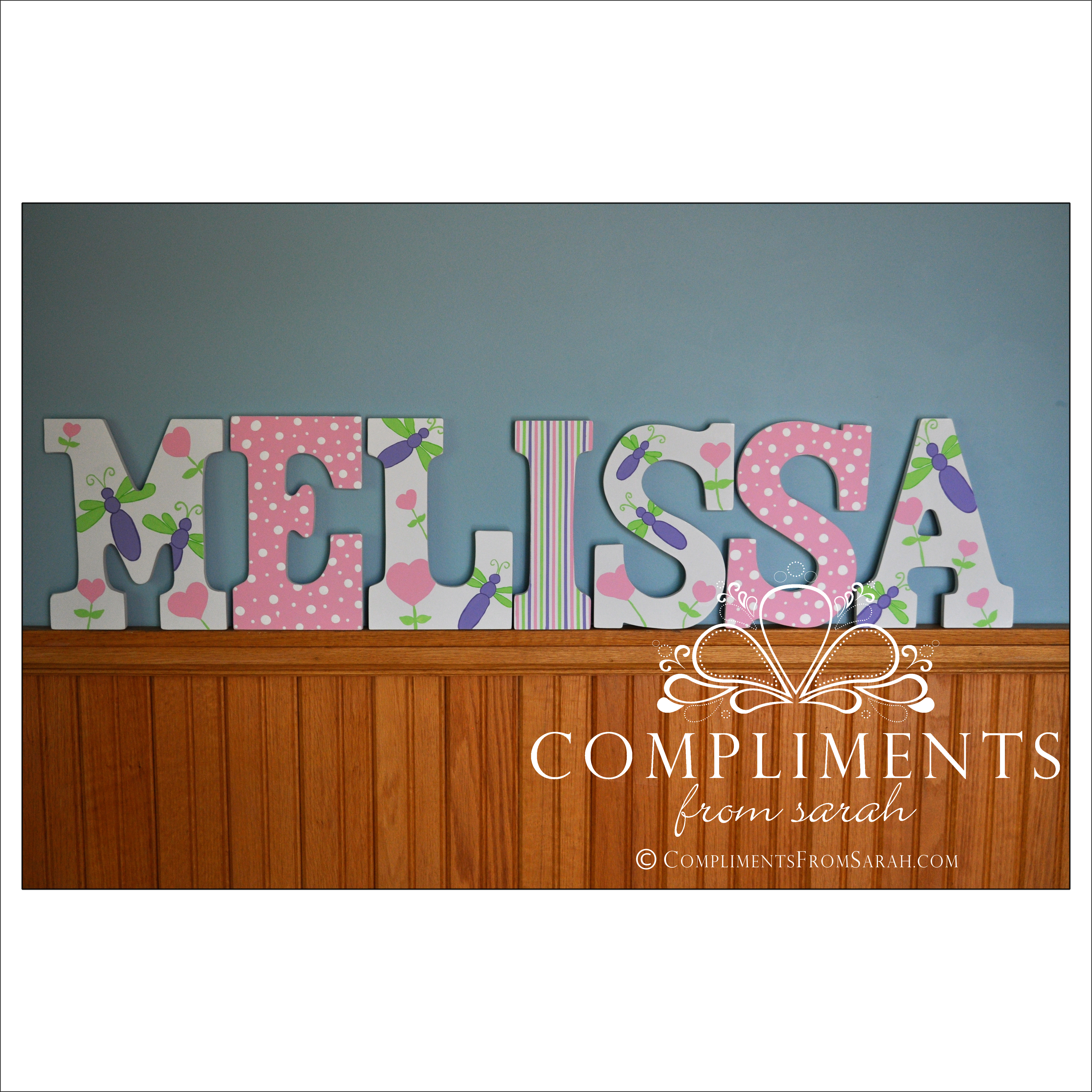 custom painted for twin baby girl, melissa, she shares a room with her twin sister rebecca, they have similar, but different crib bedding sets. these letters were created to blend the color schemes while keeping their own individual themes.