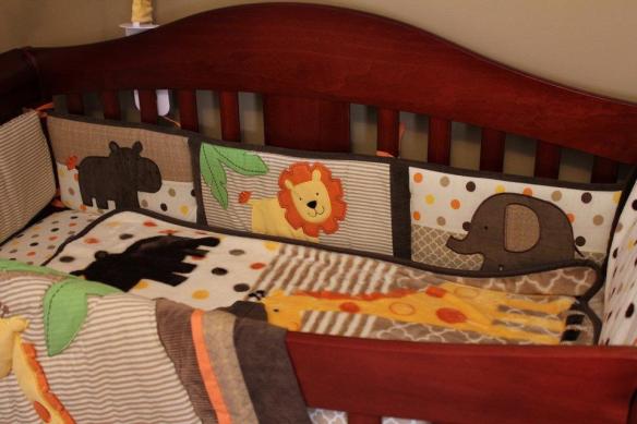 Polka dots, leaves & adorable lions & giraffes are featured on the letters.The boys nursery has cool latte colored walls complemented by